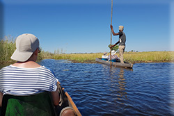| We vertrekken om 08:00 en reizen naar het station Mokoro waar we aan boord van de Mokoros zullen gaan. Een mokoro, een handgemaakte kano, is hét vervoersmiddel van de delta. We gaan op pad en verkennen de delta vanaf het water: een leuke afwisseling en een unieke ervaring! In een mokoro is plaats voor twee personen en een gids, die u door de wateren van de delta leidt. We glijden geruisloos door het water, tussen het wuivende riet, de papyrusplanten en de waterlelies door. Op een van de eilanden in de delta gaan we aan land en maken we een wandeling. Als we geluk hebben, zien we onderweg kuddes zebra’s, gnoes en vele vogelsWe zullen door de grachten van de Okavango-delta in een Makoro door een poler worden geduwd. Er zal een mogelijkheid zijn om een optionele vlucht over de Okavango Delta te maken. Verzorging: Ontbijt, lunchpakket, Mokoros, Diner Overnachting: Island Safari Lodge / Maun Lodge (OPTIONELE VLUCHT OVER DE OKAVANGO DELTA) | ||